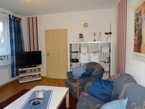 • Wohnzimmer mit Flachbild-TV, CD-Player, Gesellschaftsspielen, Büchern