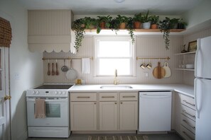 The fully equipped kitchen features an oven range, dishwasher, refrigerator, garbage disposal, and microwave. Home to dozens of plants, you will love cooking alongside friends and family in this eclectic eat-in kitchen.