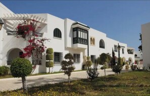 Conveniently located near the Mediterranean's first marina, Port El Kantaoui, our accommodation offers the perfect blend of luxury and comfort. Les Maisons des Jardins is surrounded by a spacious garden square adorned with beautiful trees and flowers, providing a serene environment for relaxation. Guests can enjoy a 30-meter diameter musical fountain, a classic fountain, and a well-equipped natural park.