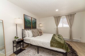 This home was designed with convenience and comfort in mind. It is perfect for a small group of 4 or a single person traveling for work. The bedroom boasts an extremely inviting queen mattress that is so comfortable you may never want to leave. In the living room there is a queen sleeper sofa offering additional sleeping space. Relax and unwind while watching your favorite show on our 55” wall mounted smart TV.