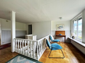 Im Obergeschoss befinden sich drei Schlafzimmer mit einem Doppelbett und zwei Schlafzimmer mit einem Doppelbett und einem Einzelbett für Kinder bis 12 Jahre.