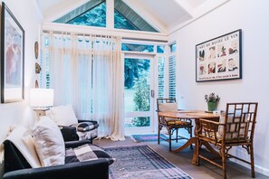 Das lichtdurchflutete Interieur ist eine Boutique mit viel Design, Detailreichtum und Annehmlichkeiten. Der sichere Eingang führt in einen schönen Wohn- und Essbereich unter einer Gewölbedecke mit einem gemütlichen Kamin und hervorgehobenen Fenstern, die einen herrlichen Blick auf die alten Regenwaldbäume bieten.