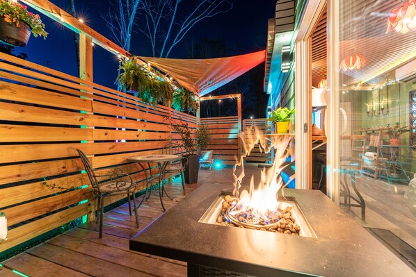 "Tiny Sun". The newest Ultra Luxury Shipping Contain built by the talented community members. In total there are 3 luxury tiny homes on the property, all available through Airbnb. It is 300 sq ft including the 80 sq ft bathroom with dual waterfall showers and heated floors. Lotus flower lights hang from 9 foot 6 inch ceilings. 200 sq ft enclosed deck for your furry family member(s). Smart lighting with 16 million color choices, 400 MB Internet, Amazon 3D speaker, TV with Prime/Netflix.