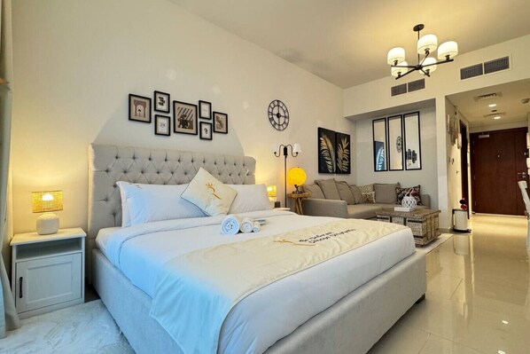 The main area features a luxurious king-size bed with high-quality linens, ensuring a restful night’s sleep. For additional guests, a comfortable sofa is available, along with a large Smart TV for entertainment. A dining area for two is perfect for enjoying your meals or a quiet drink.