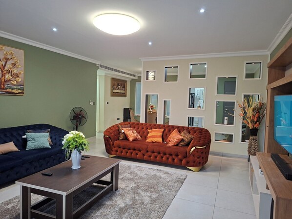 Alle Zimmer bei Delightful 3-bedroom apartment in welcoming Accra neighborhood bieten Aufmerksamkeiten wie eine Klimaanlage und separate Essbereiche sowie Ausstattungsmerkmale wie kostenloses WLAN und Esstische.