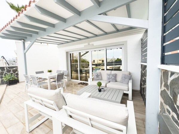 Willkommen im Haus deiner Träume in Callao Salvaje, Adeje!Eingebettet in die ruhige Wohn-Enklave von Callao Salvaje lockt dieses atemberaubende dreistöckige Stadthaus mit seinem unvergleichlichen Reiz. Mit einer Gesamtfläche von 152 m ² bietet diese Unterkunft viel Platz und Luxus für dich und deine Familie.Tritt ein in unvergleichlichen Luxus, wenn du das Anwesen betrittst. Die offene Küche, ein Paradies für kulinarische Enthusiasten, verfügt über viel Platz und hochwertige Geräte. Angrenzend an die Küche erwartet dich ein elegantes Badezimmer. Das Wohnzimmer, das von natürlichem Licht durchströmt wird, erstreckt sich nahtlos auf eine Terrasse mit atemberaubendem Meerblick. Und das Pièce de Résistance? Dein eigener privater Pool, in dem Entspannung, Unterhaltung und geschätzte Erinnerungen warten.Steige in die erste Etage und genieße Ruhe und Aussicht. Zwei geschmackvoll gestaltete Schlafzimmer bieten Komfort und Privatsphäre, die von einem elegant gestalteten Badezimmer bedient werden. Tritt auf den Balkon für deine morgendlichen Kaffee-Rituale oder Abendsonnenuntergänge. Und über allem bietet eine charmante Dachterrasse, die perfekt positioniert ist, um einen Panoramablick auf das Meer zu genießen, eine idyllische Kulisse für Entspannung und Verjüngung.Dieses vor zwei Jahren sorgfältig renovierte Traumhaus strahlt Modernität und Charme aus. Voll möbliert, verspricht es ein stressfreies Erlebnis für deinen Urlaubsurlaub. Profitiere von kostenlosen öffentlichen Parkplätzen, die sich günstig vor dem Grundstück befinden, eingebettet an einer ruhigen Straße mit ausreichend Parkplätzen. Die Hauptstraße ist leicht erreichbar und sorgt für eine nahtlose Erkundung der Insel.Das Hotel liegt nur 10 Minuten zu Fuß oder 5 Minuten Fahrt vom malerischen Strand Playa Ajabo in Callao Salvaje und nur 20 Minuten Fahrt vom Flughafen Teneriffa Süd entfernt und ist bequem zu Fuß erreichbar. Supermärkte wie Lidl und Aldi sind nur 8 km entfernt, während das Einkaufszentrum Las Rosas nur 5 Fahrminuten entfernt ist.Verpass nicht die Gelegenheit, diese Urlaubsoase zu mieten und in ein Leben voller Komfort, Gelassenheit und unvergleichlicher Schönheit in Callao Salvaje einzutauchen. Ihr Traumurlaub erwartet Sie!
