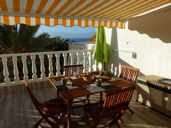 -der Blick vom großem Balkon führt auf einen Parkplatz mit viel Schotter als Ausblick. Ab 15 Uhr ist im Dez. dort keine Sonne mehr.