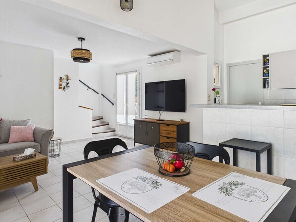 Es umfasst: 3 Schlafzimmer: 1 im Erdgeschoss mit einem 160x200 cm großen Bett und Zugang zur Terrasse mit Duschbad 2 im Obergeschoss mit 140x190 cm großen Betten und Duschbad Ausgestattete Küche: Backofen, Mikrowelle, Kühl-/Gefrierkombination, Induktionskochfeld, Geschirrspüler, Dunstabzugshaube Wohnzimmer mit Fernseher Klimaanlage im Wohnzimmer und einem der Schlafzimmer im Obergeschoss (Südlage) 2 Terrassen: eine vorne, eine hinten, Doppelhängematte auf der hinteren Terrasse ENDREINIGUNG INKLUSIVE - Parkplätze vor dem Haus BITTE BEACHTEN: Bettwäsche (Bettlaken, Handtücher, Matratzenschoner, Toilettenpapier, Reinigungsmittel, Toilettenartikel) NICHT INBEGRIFFEN HAUSTIERE NICHT ERLAUBT RAUCHVERBOT
