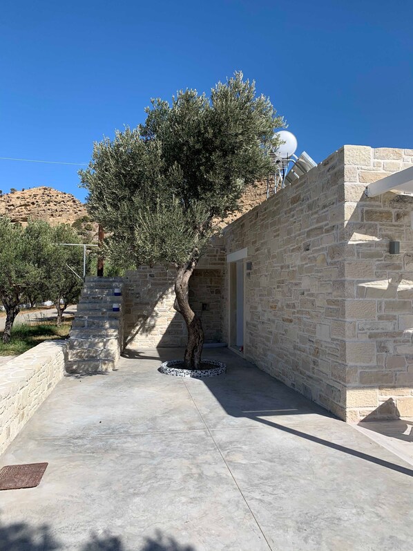 Das Apartment aus Naturstein wurde 2020 fertiggestellt und wurde mit viel Liebe zum Detail eigerichtet und ausgestattet. Den Gastgebern liegt das Thema Nachhaltigkeit am Herzen. Daher ist der Olivenhain weitestgehend naturbelassen. Das Apartment bietet alles was ein angenehmer Aufenthalt benötiget. Eine eigene Küche, ein separates Schlafzimmer, ein Wohnzimmer mit einem Schlafsofa und einer wunderbaren Aussicht in den Olivenhain. Eine eigene Terrasse rund um das Haus bieten je nach Tageszeit genug Schatten oder Sonne um optimal zu entspannen. Eine in das Mauerwerk und mit Mosaikboden ausgestattete Außendusche lädt zum Abkühlen oder Abduschen nach einem Strandgang ein. Die vielen Obst- und Olivenbäume laden die Gäste unter den ausladenden Blätterdächern zum Entspannen ein. Für alle Gäste gibt es eine Flasche Olivenöl gratis von dem Olivenhain auf dem sie wohnen.