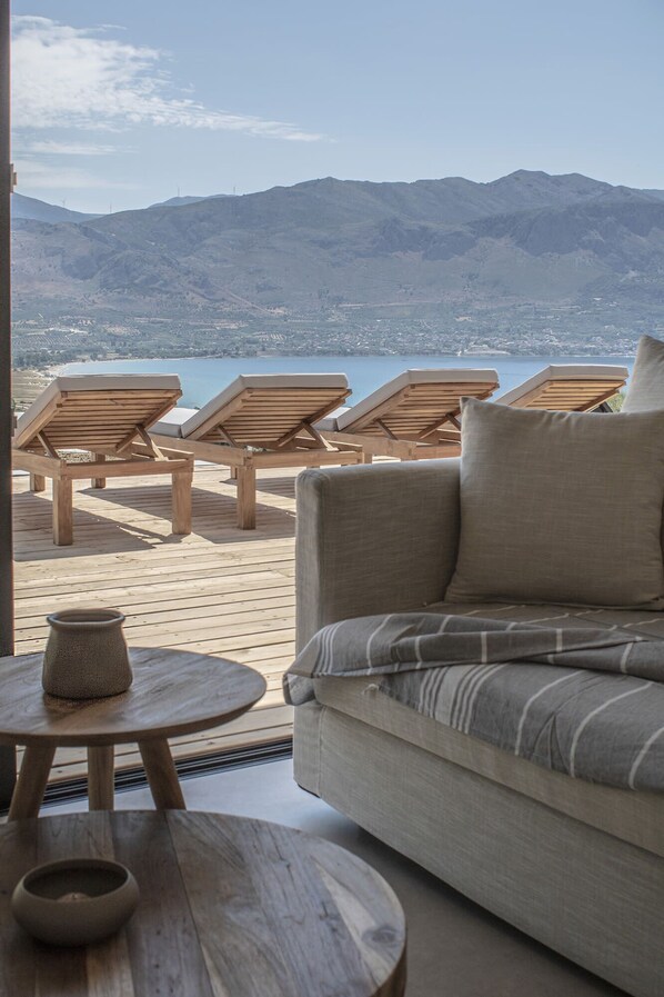 The lounge and kitchen have perfect views from the glass doors that run the entire length of the room and open out to the external areas and the pool. The modern kitchen is fully equipped with the all the essentials required, coffee maker, microwave, oven, hob, toaster, kettle and washing machine. The lounge offers seating where you can watch the sunrise and dream of the day ahead, read a book or watch the latest films on the 50" TV. A teak dining table is placed near the glass doors’ making an incredible setting for evening meals.