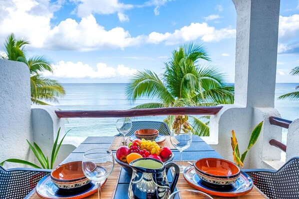 Located on the third floor, guests can gaze upon the beach and turquoise waters from the beachfront terrace, a fully equipped kitchen, breakfast bar, dining, and living areas. Large sliding glass doors bring plenty of natural light to enter, and when opened, welcome fresh ocean breezes flow. The large terrace is furnished with a table and chairs, and comfortable lounging.