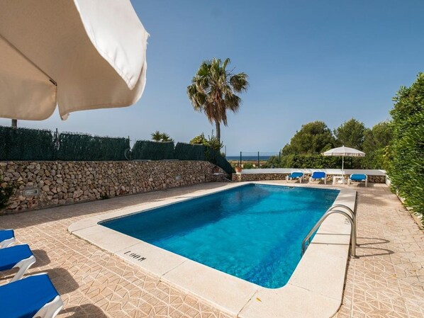 Diese schöne, zweistöckige Doppelhaushälfte mit eigenem Garten und Swimmingpool befindet sich in Torre Solí Nou und bietet einen spektakulären Blick auf das Meer und den Strand von Son Bou. Der Gemeinschaftsbereich befindet sich im Obergeschoss und besteht aus einem Wohn- und Esszimmer, einer voll ausgestatteten Küche, einem Badezimmer, einem Zweibettzimmer und einem Waschraum im Freien.