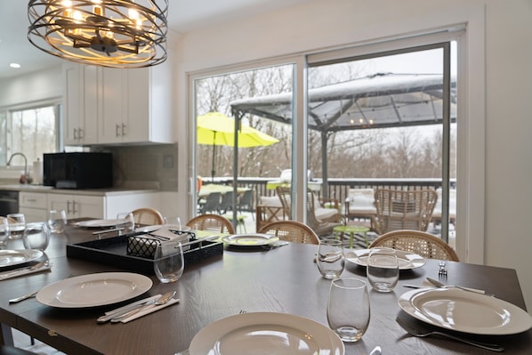 This kitchen is among the best you'll find in the Poconos! Completely remodeled, with brand new, modern appliances, the kitchen essentials, and a coffee station (Keurig & coffee pods included). This space opens up to the main living room, and also has countertop seats with a beautiful view out the back deck!