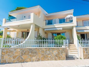 Das Haus ist auf zwei Etagenverteilt. Im Erdgeschoss finden Sie ein helles Esszimmermit Sofa, einen Tisch für sechs Personen, eine voll ausgestattete Kücheund eine Terrasse mit direktem Blick auf die Strand von Puerto de Alcudia. In der oberen Etage gibt es drei Schlafzimmer, die mit natürlichem Licht durchflutet sind: Das Hauptschlafzimmer verfügt über ein Doppelbett (150 cm x 190 cm) und eine Terrasse mit Meerblick, während das zweite Schlafzimmer mit zwei Einzelbetten (90 cm x 190 cm) ausgestattet ist, und das dritte, mit einem Etagenbett, ist perfekt für die Kleinen.