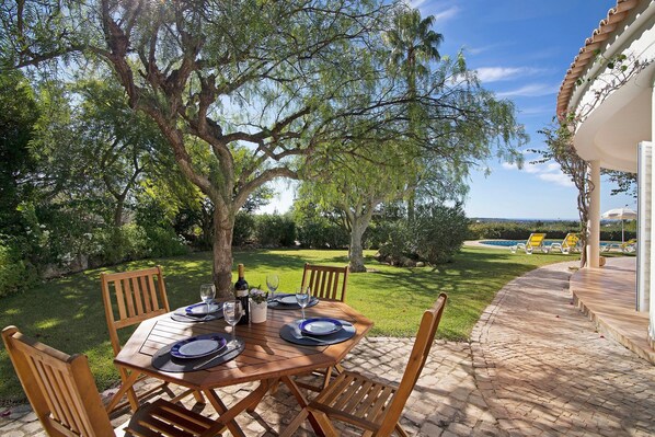 Die Villa verfügt über einen privaten Außenbereich mit Pool, Garten, Gartenmöbeln und einem Grill. Hier können Sie vom Alltag abschalten und die Sonne genießen.