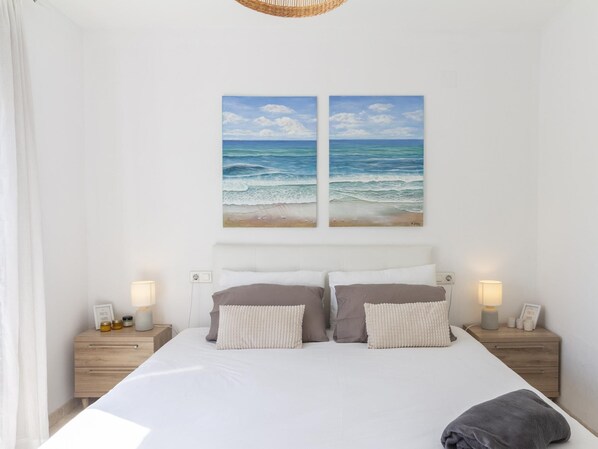 Dieses Duplex-Apartment bietet im Obergeschoss ein komplett ausgestattetes Badezimmer sowie ein Schlafzimmer mit einem 190 cm breiten Doppelbett. Die gesamte Wohnung ist vollständig klimatisiert.