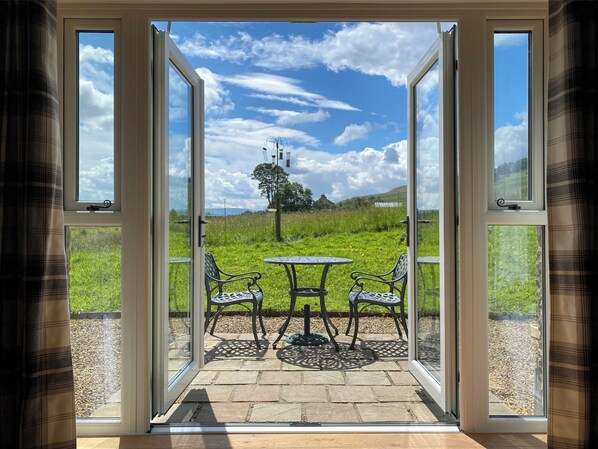 Wohn- / Esszimmer: Mit elektrischem Holzofen, DVB-T-TV, DVD-Player und Terrassentüren zum Garten.