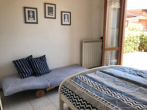 ein zweites kleines Schlafzimmer mit zwei Einzelbetten und Zugang zum Garten mit Blick auf. Die Wohnung verfügt auch über eine voll ausgestattete Küche (Spülmaschine, Backofen, Waschmaschine, etc.), ein Badezimmer und eine große Tiefgarage. Zu den Vorteilen, ist diese Wohnung sehr ruhig und sehr kühl im Sommer. Es befindet sich in 100 Meter Entfernung vom Strand und den Einkaufsmöglichkeiten (Supermarkt, Bäckerei, Bars, Restaurant, Eis-Eisgeschäft, Fischverpflegung Geschäft etc.) sind zu Fuß erreichbar.