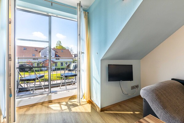 Die helle und gemütliche Ferienwohnung Lisa befindet sich im Obergeschoss des Ostseeferienhauses Drachenflieger. Die Ferienwohnung verfügt über ein separtes Schlafzimmer mit Doppelbett und Kleiderschrank, einen Wohn- Essbereich mit umfangreich ausgestatteter Küchenzeile (Kühlschrank mit Gefrierfach, 4- Platten- Herd, Backofen, Kaffeemaschine, Wasserkocher, Toaster) sowie einen Essbereich und Sitzecke mit ausziehbarer bequemer Schlafcouch. Vom Wohnbereich gelangen Sie auf den Balkon/Loggia. Bad mit Dusche und WC.