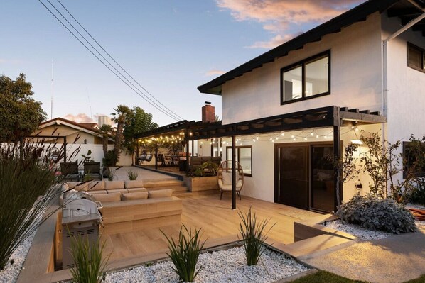 The amenities in this home truly set it apart. No expense was spared renovating this home inside and out. Outside, you’ll find a resort-style backyard oasis featuring a sparkling pool and hot tub, a sunken conversation area with a cozy firepit, and plenty of patio seating. Enjoy meals al fresco at the outdoor dining table with the BBQ grill, perfect for sunny California evenings. The large grass play area offers space for games and fun, ensuring everyone in your group is entertained.