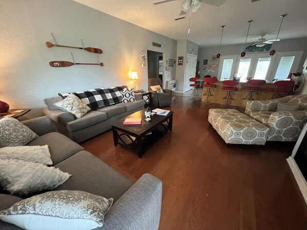 This fully accessible house is the perfect home base for your trip to Andalusia. With 4 cozy bedrooms including a king, queen, bunk, and twin beds, this amazing property offers a host of opportunities to gather with family and friends to make memories. You'll find all the essentials like AC, heating, WiFi, and washer/dryer to make your stay comfortable. In terms of accessibility, there is a Bruno Vertical Platform Lift to get to the main level, threshold ramps at both access doors, a zero-entry roll-in shower, electric hospital bed, hoyer lift, lift chair and fully reclining shower chair. The 2 bathrooms are equipped with a shower, bidet, and hair dryer for your comfort. Outdoors is also super accessible with smooth concrete under the house and a total covered entertainment area including Cantina bar, TV/Audio wall, game tables, charcoal grill, kids chalk table, and extra wide sidewalks to the Lakeside Pavilion. Included in your stay are access to 5 kayaks, 1 extra long canoe and two pedal boats, plus basic fishing poles and gear. With all beds occupied, there is room for 13, but don't count out the two twin cots and the queen sofa bed in the den! The wrap around deck upstairs is perfect for coffee in the morning, bird-watching, quiet reflection or a big family meal at the accessible picnic table. Finally, there is the covered Lakeside Pavilion, with a fire pit area, an 8 ft accessible picnic table and other seating that can be moved to fit your group - complete power and lights, too! Modified in 2021 to be a safe vacation space for ALS patients and their families, the extreme accessibility also lends itself well to Grands or others who just can't do the stairs due to age or illness. John-boy's Place has hosted over 24 guests with extreme accessibility needs since beginning rentals in March of 2023, but it is just right for ANY large family group and has something for all ages.