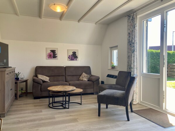 Die komfortabel eingerichtete Wohnzimmer mit Holzofen und gut ausgestatteter offener Küche (unter anderem mit Mikrowelle und Dolce Gusto-Maschine) hat direkten Zugang zur Sonnenterrasse auf der Südseite des Hauses.