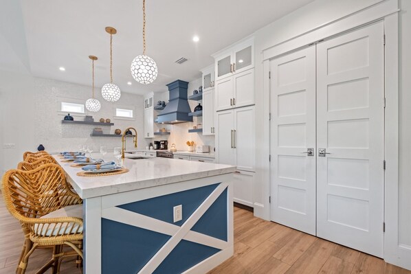 Step into a sun-filled sanctuary with vaulted ceilings, curated coastal decor, and expansive windows. The living room features plush seating, a smart TV, and balcony access. The chef’s kitchen is a showpiece with premium appliances, quartz countertops, and an oversized island, perfect for entertaining. Gather in the dining area for meals shared in style.