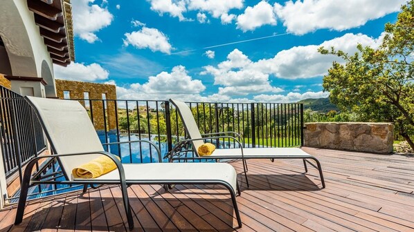 Auch der Outdoorbereich bietet einiges. Eine prächtige Fachwerk-Veranda kann vom Wohnbereich aus betreten werden. Hier finden Sie einen entspannenden Chill-Out-Bereich und einen Essbereich, obwohl Ihre Sicht vom Infinity-Pool und dem Blick auf den perfekt gepflegten Garten und den Golfplatz, der das Anwesen umgibt, bestimmt ist. Der Garten ist mit einem gemauerten Grill ausgestattet und das Grundstück ist komplett eingezäunt, um Privatsphäre und Sicherheit für alle Gäste der Villa und deren Haustiere zu gewährleisten. Da die Villa in der Mitte des Golfplatzes liegt mit direktem Zugang zum Golf Loch n. 12, werden Sie mit einem Golfbuggy ausgestattet, um den Golfplatz zu erreichen oder fahren Sie zum Hotel Antequera, wo Sie ein reichhaltiges Mittag- oder Abendessen genießen oder im hoteleigenen SPA entspannen können.
