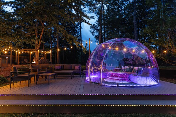 ✔ Outdoor Spaces: Covered seating, grill, 2 fire pits, hot tub, sauna, and outdoor games
