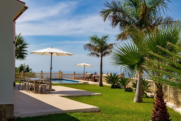 The large stone terrace is nicely furnished with several dining tables and chairs, loungers with drinks tables, umbrellas, outdoor sofa, etc. The view is magnificent over both the beautiful Andalucian mountains and the Mediterranean Sea.