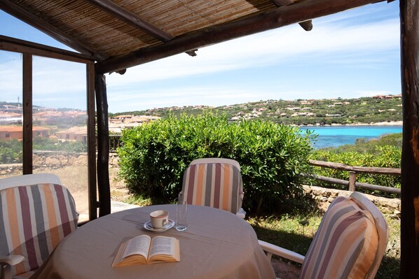 The apartment, on the ground floor of a house, features a large garden and terrace furnished with dining area, outdoor kitchen and outdoor sofas where guests can relax and enjoy the breathtaking sea view. The entrance opens onto the living area, featuring a living room equipped with two single sofa beds, a dining table, a TV and a fully-equipped kitchen. The sleeping area includes a bedroom with a queen-size bed, a closet and access to the terrace. A bathroom with shower completes the layout.