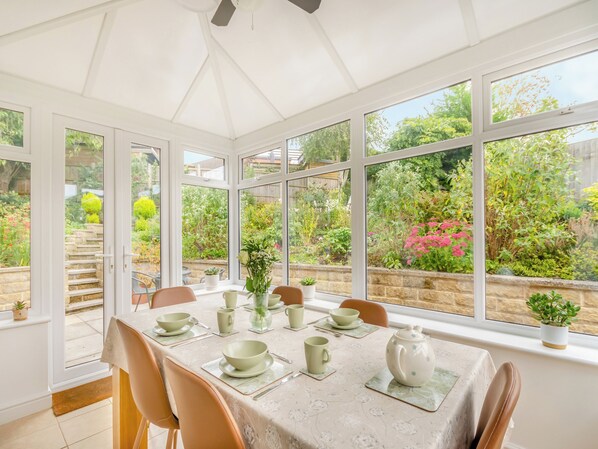 Shower Room: Walk-In Shower, Toilet. Gas central heating, electricity, bed linen, towels and Wi-Fi included. Travel cot available on request. Highchair. Garage with freezer, washing machine and tumble dryer. Rear garden with sitting-out area, garden furniture and barbecue. Bike store. Private parking for 3 cars. No smoking.. A charming two-bedroom, one-bathroom holiday bungalow located in the picturesque town of Ashbourne, Derbyshire. This cosy and well-appointed bungalow offers a comfortable and relaxing retreat as your base in this popular Peak District town. The bungalow offers a tastefully decorated living room, furnished with comfortable seating and a flat-screen TV and reading area. Adjacent to the living room is a conservatory/dining room with patio doors onto the rear garden. There is a fully equipped kitchen, complete with modern appliances. The master bedroom is furnished with a comfortable double bed, while the second bedroom features two single beds, making it ideal for children or additional guests. Both bedrooms are thoughtfully decorated and provide a peaceful atmosphere for a good night’s sleep. The bathroom is spacious and includes a walk-in shower, toilet, and sink. Fresh towels are provided for your convenience. There is an outhouse located within the garage which conveniently provides space to securely store bikes as well as having a washing machine, dryer, sink and hanging space for wet clothes. Outside, you’ll find a lovely garden area with a patio, equipped with outdoor furniture. It’s a perfect spot for enjoying a morning coffee or an evening drink while taking in the beautiful surroundings.