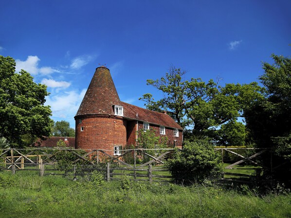 Das Oast verfügt über ein charmantes kreisförmiges Wohnzimmer und eine große Küche im Landhausstil, die zum nach Süden ausgerichteten Garten führt, der eine echte Sonnenfalle ist. Die Besitzer begrüßen Gäste mit einem Hund und der Garten ist komplett eingezäunt. Nach Absprache können Sie auch den beheizten Außenpool der Eigentümer nutzen.