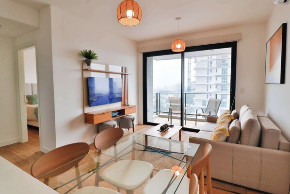 This space is designed to provide our guests with maximum comfort. It accommodates three people and includes: a queen-size bed, one bathroom, a balcony, kitchen, electric oven, refrigerator, microwave, kettle, blender, sandwich maker, coffee maker, dishes, iron, bed linens, towels, hair dryer, Wi-Fi, air conditioning, Smart TV, and furniture with storage for all your belongings.