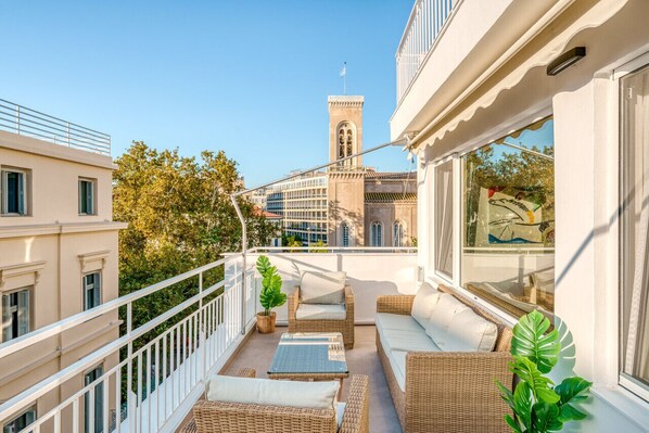 An amazing 100m2 apartment with 2 large double bedrooms with one king size and one queen size bed, 2 large bathrooms with walk-in showers, a living room with a stunning view of the Acropolis, a kitchen and a separate dining area. The large terrace offers an amazing view of the Acropolis, with an additional seating and dining area. Features a fully fitted kitchen with a microwave oven, a fridge, Nespresso coffee maker, American coffee maker and kitchenware. A large 55-inch Samsung TV in the living room with 50-inch Samsung TVs in both bedrooms with Netflix available in each one. No smoking No parties No professional filming