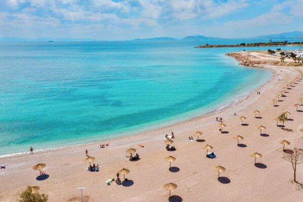 Within a short drive, Kavouri Beach (5.5 km) offers a long stretch of soft sand and shallow waters, making it especially popular with families. Akti Vouliagmeni Beach (6.5 km) is another sandy favorite, known for its organized facilities, cafés, and water sports. A bit further along the coast, Astir Beach Vouliagmeni (7 km) is a well-known destination offering crystal-clear waters, luxury amenities, and chic beach clubs for a premium seaside experience