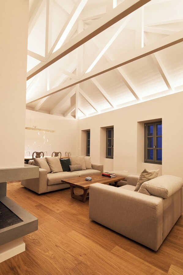 Our spacious living areas feature high ceilings and cozy seating, perfect for relaxation. Artistic hanging sculptures and elegant decor create a serene and inspiring atmosphere.