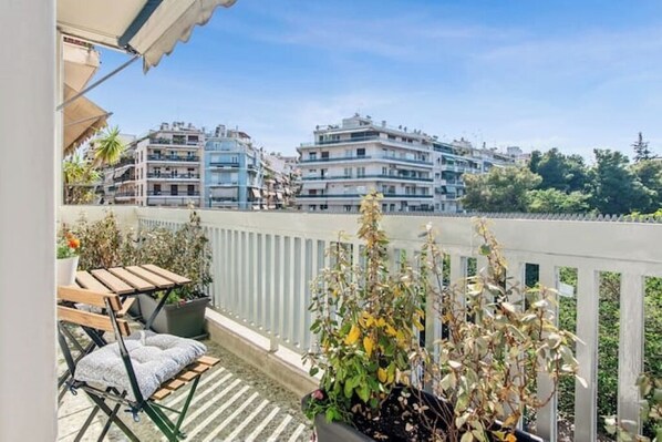 Balkon mit Blick auf den Lycabettus-Hügel, sehr hell und ruhig.