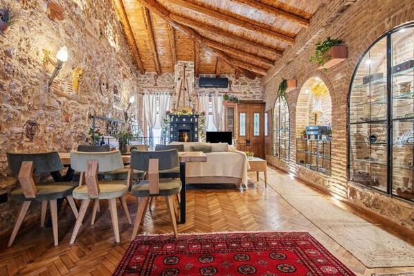 Built entirely from stone, Olvion House preserves the essence of old Athens while embracing a warm, inviting design. The renovation highlights the natural textures of the original structure—exposed stone walls, wooden beams, and soft earthy tones—creating a space that feels both authentic and serene. Rustic details, carefully curated furniture, and cozy lighting make the interior feel like a true retreat from the city's energy.