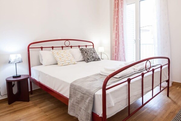 The bedroom is furnished with a comfortable double bed and offers a cozy and peaceful ambiance, perfect for a good night's sleep. Bed linens are provided, along with blankets and pillows to ensure maximum comfort. The apartment also features air conditioning throughout, allowing you to adjust the temperature to your liking and escape the summer heat.