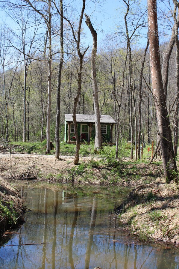 This cabin offers a 'glamping' experience vibe: The 'Topiary' cabin is a shared shower house rather than an in cabin bathroom. The shower house located near the entrance (about a 2-minute walk away). The facility includes two private, separate stalls, each with its own shower and toilet. It's a creative tiny home studio layout with a porch view of the forest, wildlife and hills on 30 acres. Explore trails along the creek and rock formations while being 10 minutes from the lively culture of Athens, and Ohio University. There is radiator heat and wall A/C. Please note that while there is a bed, you’ll need to bring your own sleeping bags/bedding and pillows.