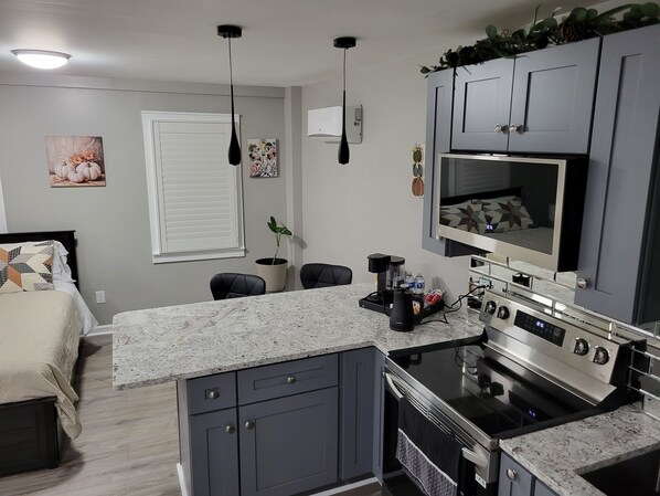 Discover the perfect blend of modern design & home-like amenities at this brand-new, tranquil studio escape. Thoughtfully arranged for your comfort, the space features distinct areas for relaxing, sleeping, & dining, all within a stylish & private setting. Ideal for solo adventurers, couples, or business travelers, this unique, luxurious getaway promises a seamless & comfortable stay!