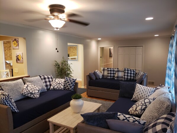 This place was perfect for my family. We had a group of 17 and needed a place big enough to accommodate sleeping 17 people with 2 people sleeping in each queen sized bed and 2 people sleeping in each full sized bed. 8 of the beds are twin sized beds, 3 of which are twin sized air mattresses and 2 of which are trundle beds. The trundle beds are sturdy enough for adults but we had the kids sleep on them. The back yard is huge and there is a large back deck that was perfect for cooking out. I will definitely book this place again in the near future for a family function.