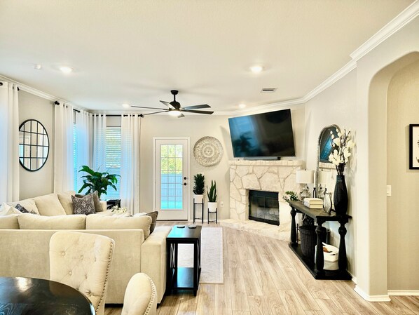 Welcome to your home away from home! This cozy and modern home offers plenty of space for families, friends, or work travelers looking for comfort and convenience. Nestled in a quiet neighborhood, yet minutes away from the action, you'll get the best of both worlds! ★ Master Suite: Sink into the Cal-King bed with a 12" memory foam mattress and indulge in ultra-soft linens and extra pillows for a restful night’s sleep. Unwind in your private bathroom featuring a walk-in shower, separate soaking tub, bath bubbles, Epson salts, bath pillow, and towel warmer. The perfect escape after a day out ★ Guest Rooms: The two guest rooms each feature plush queen beds with ultra-soft linens, extra pillows, blackout curtains, and spacious walk-in closets ★ Kitchen & Dining: Cook up your favorite meals in the fully equipped kitchen, which includes double ovens, a water purification system, air fryer, skillet, rice cooker, and Ninja brand cookware. Enjoy complimentary coffee, decaf, tea, and spices ★ Living Area: Lounge on the ultra-comfy sectional as you cozy up by the fireplace or stream your favorite shows with our sound bar TV setup. The living space will also be seasonally decorated, adding a festive touch to your stay ★ Home Office: If you need to work during your stay, take advantage of the dedicated workspace, complete with high-speed internet, a laptop monitor, a Bluetooth mouse and keyboard, and printer. Glass French doors offer privacy for phone and virtual meetings ★ Fully Stocked Laundry Room: The laundry room features a washer and dryer with complimentary detergent, fabric softener, and dryer sheets, as well as an iron, ironing board, and steamer to keep your wardrobe looking fresh ★ Backyard Retreat: Step outside to a covered patio with a BBQ grill and outdoor furniture. The backyard is fully fenced, providing a safe space for children ★ Easy Parking & Nearby Attractions: Enjoy free parking in our driveway and on the street. Walk just 2 minutes to a community park or 10 minutes to explore food and coffee trucks. We’re also conveniently located 16 minutes from the airport and the Circuit of the Americas (CoTA) and just 20 minutes from downtown Austin and the vibrant SoCo district ★ Why Choose this home? Whether you're in town for a fun or relaxing getaway, a family vacation, or remote work, this home is designed with comfort and convenience in mind to provide you with the best experience possible!