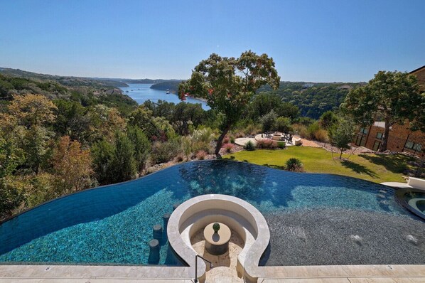 `Lone Star Luxe` - When Luxury meets `Hill Country Glam` and the renowned Lake Travis.... this stunning 5 bedroom home is located on the most prized cove of Lake Travis- Devil`s Cove! The house that does not hold back and defines what `A Stay Above The Rest` truly means, offering an incredible custom heated pool with a hot tub and themed lighting, a media room, game room, stunning furnishings, high-end appliances, and a completely outfitted kitchen fit for a chef! Read more about this space