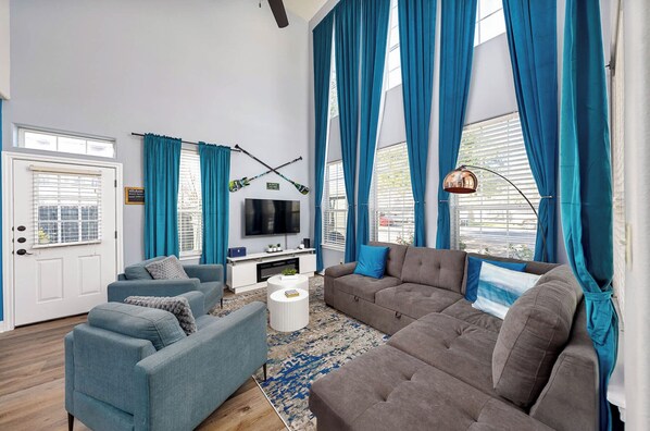 • Stylish open-concept living room with high ceilings & electric fireplace