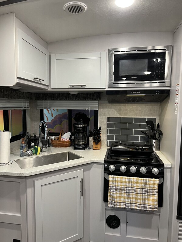 Kitchen: Two burners indoor | George Foreman grill | Refrigerator | Microwave | Dishwasher | Toaster | Drip style coffee pot | Cooking basics | Dishware & flatware | Pots & pans