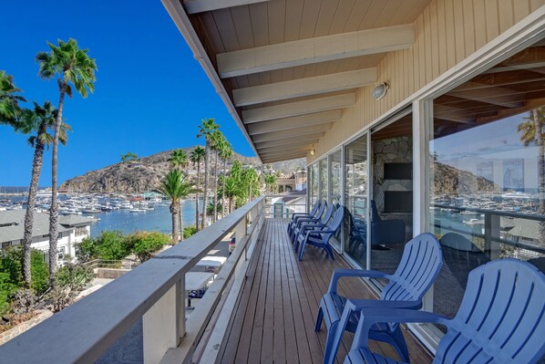 The view from the front balcony and living room was beyond spectacular!!! 8 adults sat comfortably on the balcony with a birds eye view of the July 4th festivities, including the harbor dinghy parade and the fireworks. The house was clean, with a slight musty odor. Seating in the living room easily accommodated our group, with newer comfy couches and swivel seats so all seats can take in the view. The bedrooms were comfortable, with two showers, two toilets and three sinks/counters.Our issues were a quirky TV connection, a table lamp in the living room had a cut cord, the power reclining couch was not connected, and the hot water took over 15 minutes to heat, and then you had a choice between almost scalding or cold. Very difficult to regulate. It was well stocked with beach chairs, toys, and games. Overall a great place to enjoy Catalina!