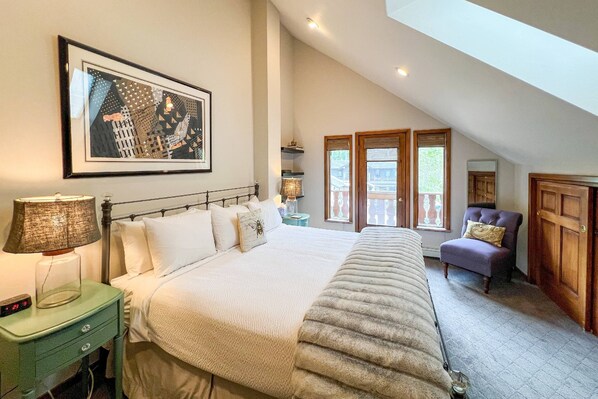 Retreat to the large primary bedroom featuring a king bed, en suite bathroom, and air conditioning—a rare luxury in the mountains!