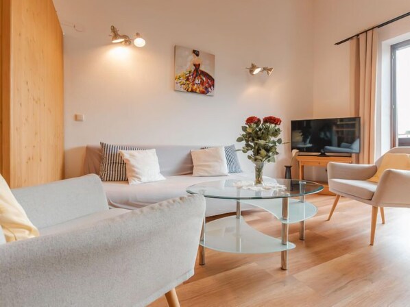 "Anna-Katharina", 1-Zimmer-Wohnung 53 m2 im 2. Stock. Objekt geeignet für 2 Erwachsene + 2 Kinder. Geräumig und hell, sehr modern und gemütlich eingerichtet: Eingang. Offene Galerie 17 m2 mit 1 Doppelbett. Wohn-/Esszimmer 36 m2 mit Panoramafenster mit 1 Doppeldiwanbett, Esstisch und Kabel-TV (Flachbildschirm). Ausgang zum Balkon. Offene Küche (Backofen, Geschirrspüler, 4 Glaskeramikplatten, Toaster, Wasserkocher, Mikrowelle, elektrische Kaffeemaschine). Dusche, sep. WC. Holzdielenboden. Balkon 10 m2. Balkonmöbel. Sehr schöne Panoramasicht auf die Berge. Zur Verfügung: Haartrockner. Internet (WLAN, gratis). Parkplatz Nr. 7. Bitte beachten: geeignet für Familien. Nichtraucher-Unterkunft. Rauchmelder, kein Fahrstuhl. Die elektische Kaffeemaschine ist eine Cafissimo. 2 Kinder bis 15 Jahren auf Anfrage möglich. Anstelle eines abgeschlossenen Schlafzimmers befinden sich manche Schlafplätze in einem offenen Bereich (Galerie, Nische etc.). 50402-000674-2020